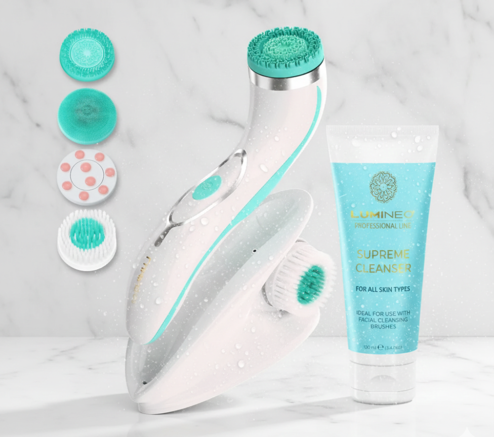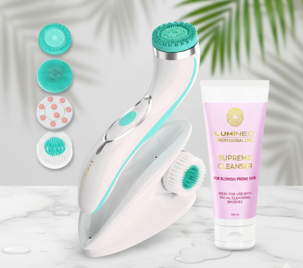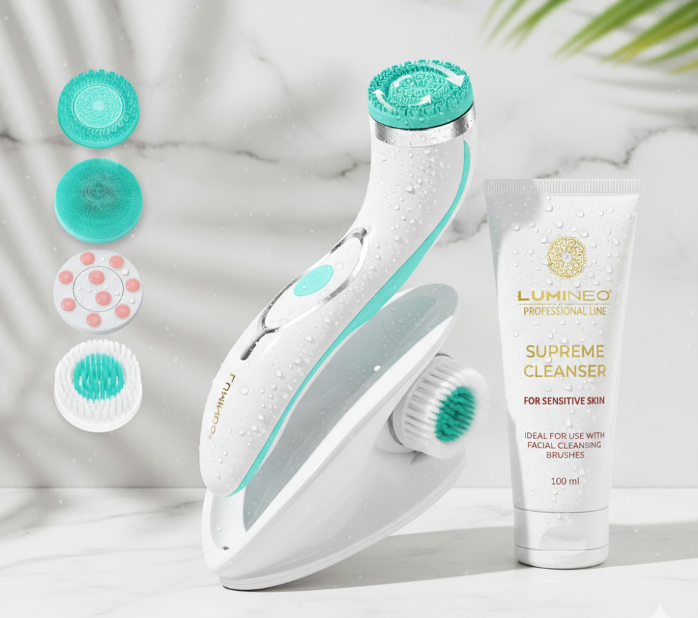 LUMINEO PRO turkio spalvos veido šepetėlis su 4 antgaliais + gelis probleminei odai