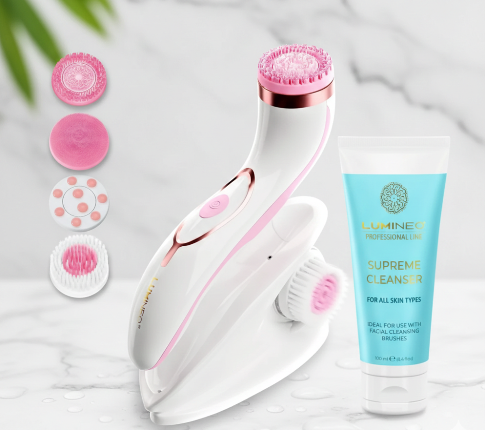 LUMINEO PRO veido šepetėlis (rožinis) su 4 antgaliais + veido gelis