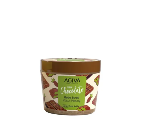 AGIVA DUBAI CHOCOLATE kūno šveitiklis su AHA rūgštimis švelniai nušveičia odą, suteikia švelnumo ir atkuria natūralų spindesį.