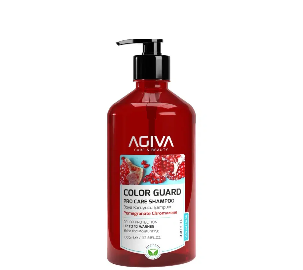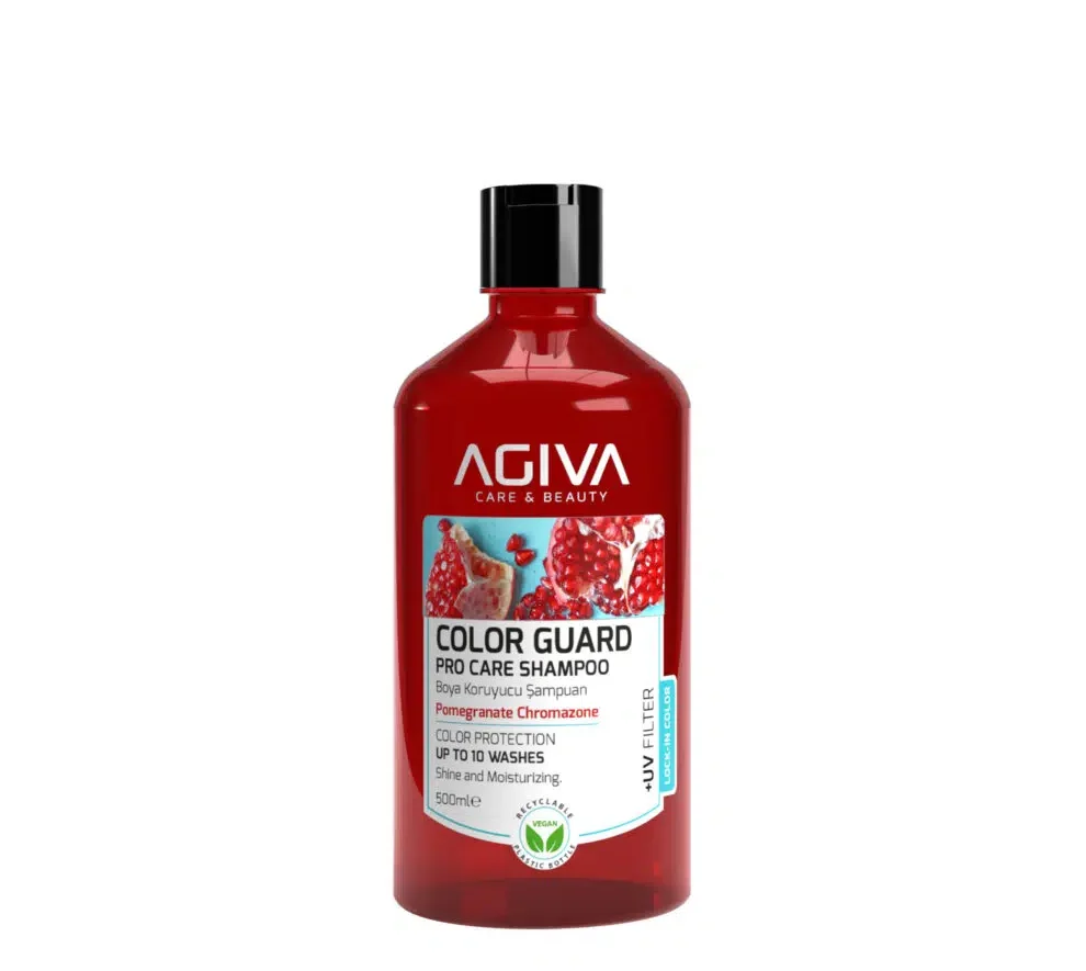 AGIVA COLOR GUARD (500 ml) – tai profesionalus veganiškas šampūnas dažytiems plaukams, praturtintas liposomų technologija ir granatų ekstraktu. Ši priemonė suteikia visapusę 7 naudų priežiūrą: saugo spalvą nuo blukimo, intensyviai drėkina, stiprina plaukų struktūrą ir saugo nuo UV spindulių. Mėgaukitės sveikai žvilgančiais plaukais ir ryškia spalva tarsi ką tik po apsilankymo pas kirpėją.