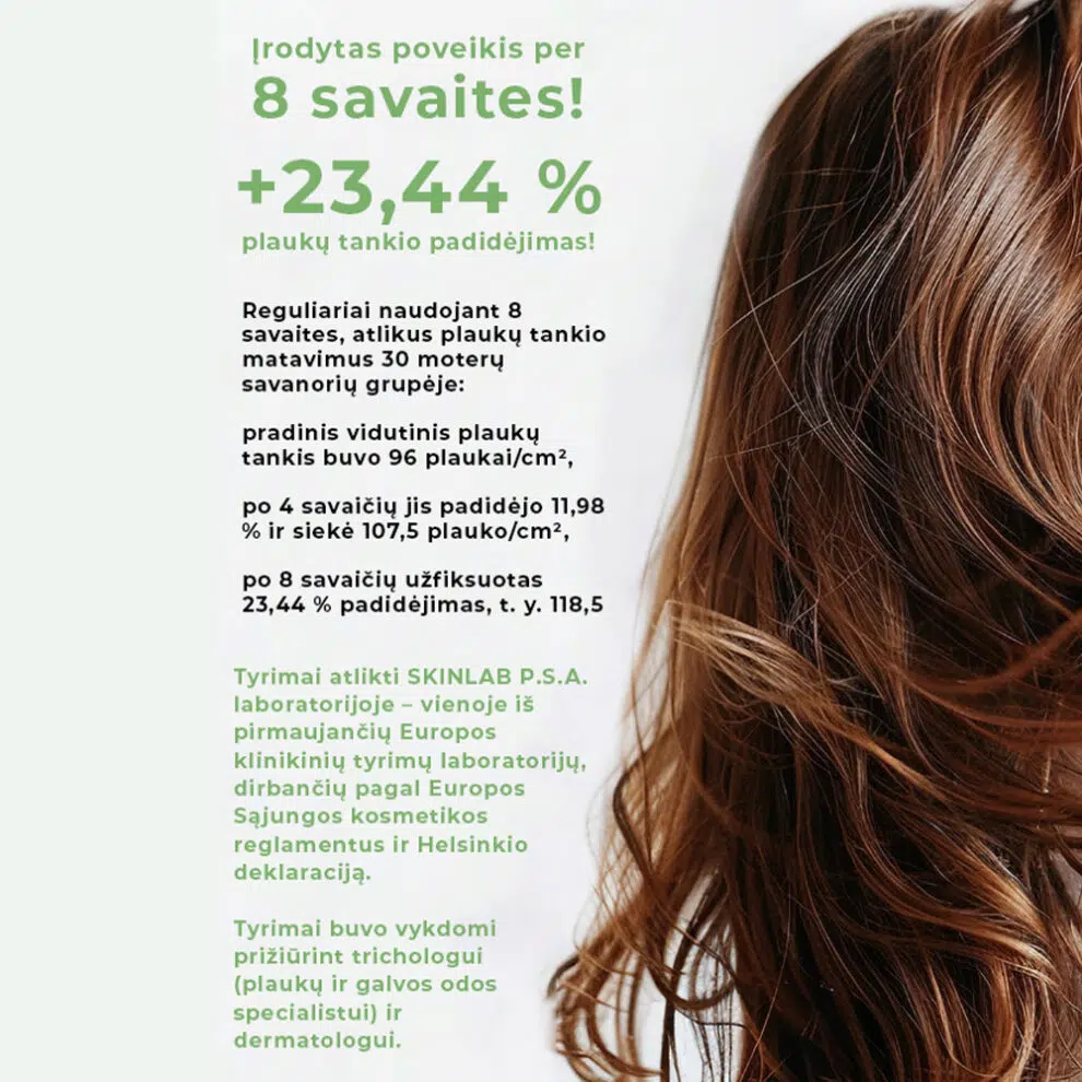 • Švelniai įmasažuokite į galvos odą, kad suaktyvintumėte kraujotaką ir stipresnį veikliųjų medžiagų įsisavinimą.