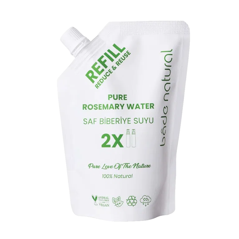Papildykite stiklinį BADE NATURAL PURE ROSEMARY WATER toniko buteliuką iš 200 ml pakuotės.