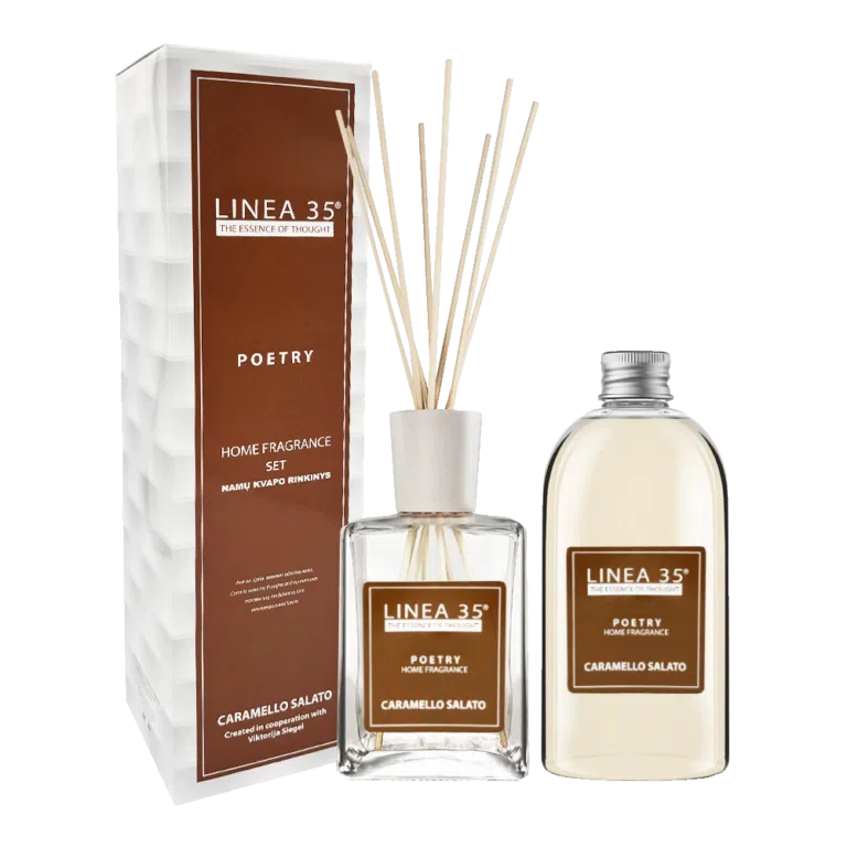 LINEA 35 CARAMELLO SALATO – tai jaukumo, šilumos ir gurmaniško saldumo kupinas namų kvapo rinkinys, kuriame karamelės ir cukraus sodrumą subalansuoja gaivus jūrinis brizas. Šis aromatas subtiliai užpildo namus švelniu saldumu, tuo pačiu nepavargina – dėl švarios vandens natos ir lengvos druskos akordo kvapas tampa išskirtinai harmoningas ir modernus.
