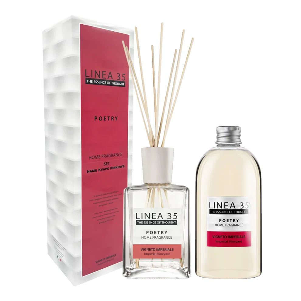 LINEA 35 VIGNETO IMPERIALE kvapų difuzoriaus ir papildymo rinkinys – tai saldžios nostalgijos ir elegancijos dermė, primenanti vasaros pavakarės pasivaikščiojimą uogų sode. Šis aromatas skleidžia brandžių vaisių, švelnių žiedų ir šiltos medienos tonus, pripildydamas namus šviesos, švelnumo ir ramybės.