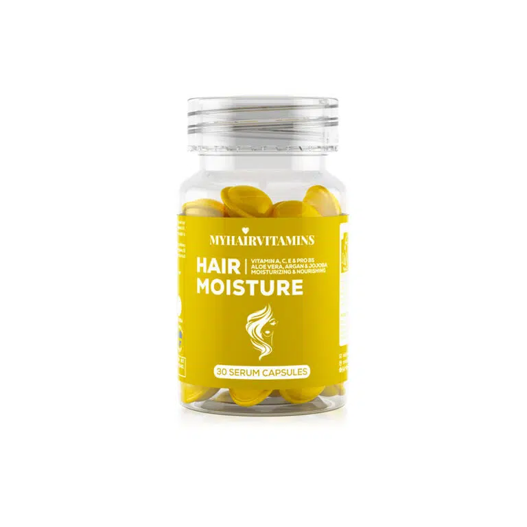 MYHAIRVITAMINS tepami vitaminai intensyviam plaukų drėgmės atstatymui HAIR MOISTURE – tai pažangus serumas, sukurtas ypač sausiems, pažeistiems ir blizgesį praradusiems plaukams. Šios kapsulės praturtintos keratino kompleksu, aloe vera, argano bei jojobos aliejais ir vitaminų A, C, E, Pro B5 deriniu, kuris intensyviai maitina, drėkina ir atkuria plaukų struktūrą.