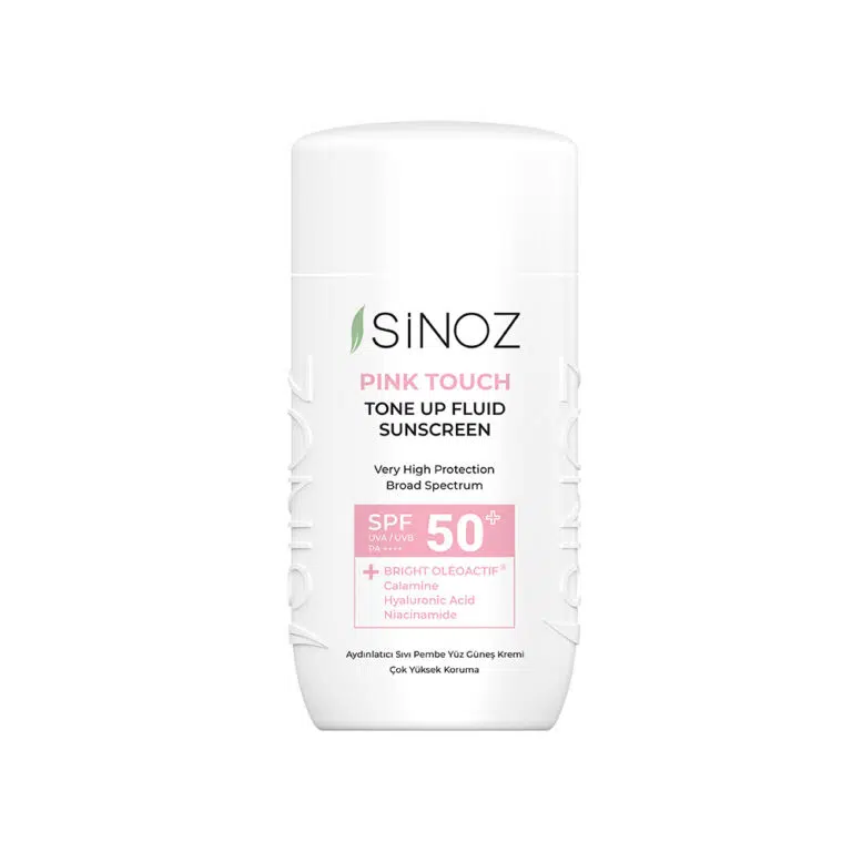 SINOZ apsauginis veido fluidas nuo saulės su SPF50+ PINK TOUCH TONE UP FLUID SUNSCREEN SPF 50+ – tai specialiai šviesiai odai pritaikytas veido fluidas, suteikiantis intensyvią apsaugą ir lengvą „tone-up“ efektą.