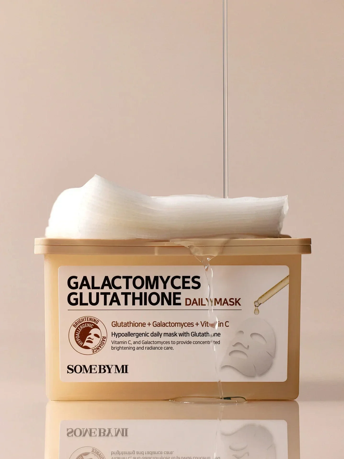 SOME BY MI Galactomyces Glutathione Daily Mask 30pc – patogus lakštinių veido kaukių rinkinys dėžutėje, skirtas reguliariam odos drėkinimui ir skaistumo palaikymui. Kaukės prisotintos esencija, kuri padeda atgaivinti pavargusią odą, suteikti jai spindesio ir komforto pojūtį.