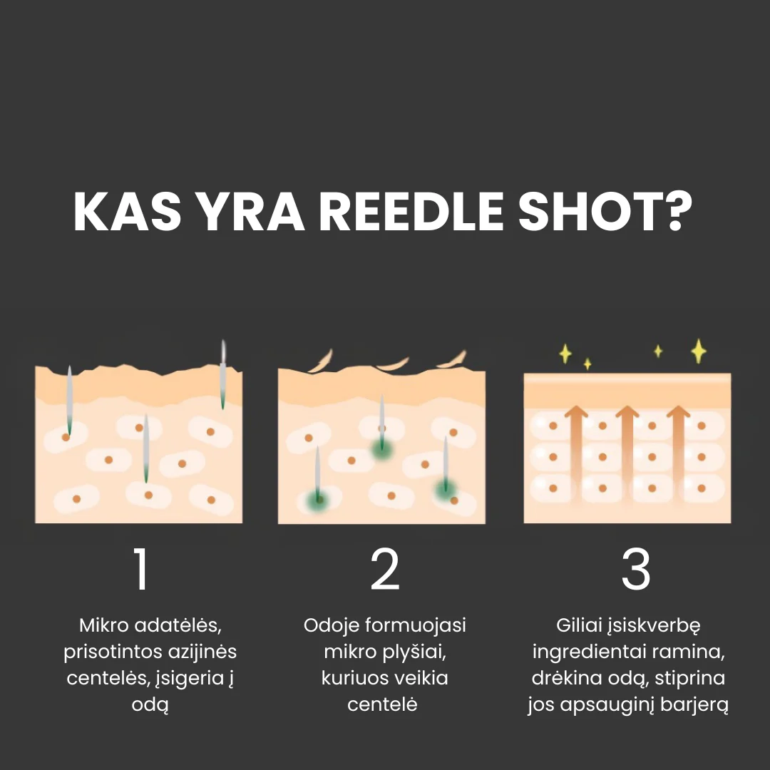 VT Cosmetics Reedle Shot 50 – pati švelniausia Reedle Shot linijos serumo-ampulės versija, sukurta tiems, kurie tik pradeda naudoti mikroadatėlių technologiją arba turi itin jautrią veido odą. Priemonė padeda veikliosioms medžiagoms efektyviau pasiskirstyti odoje, tuo pačiu užtikrinant komfortišką pojūtį ir palaipsnį rezultatą.